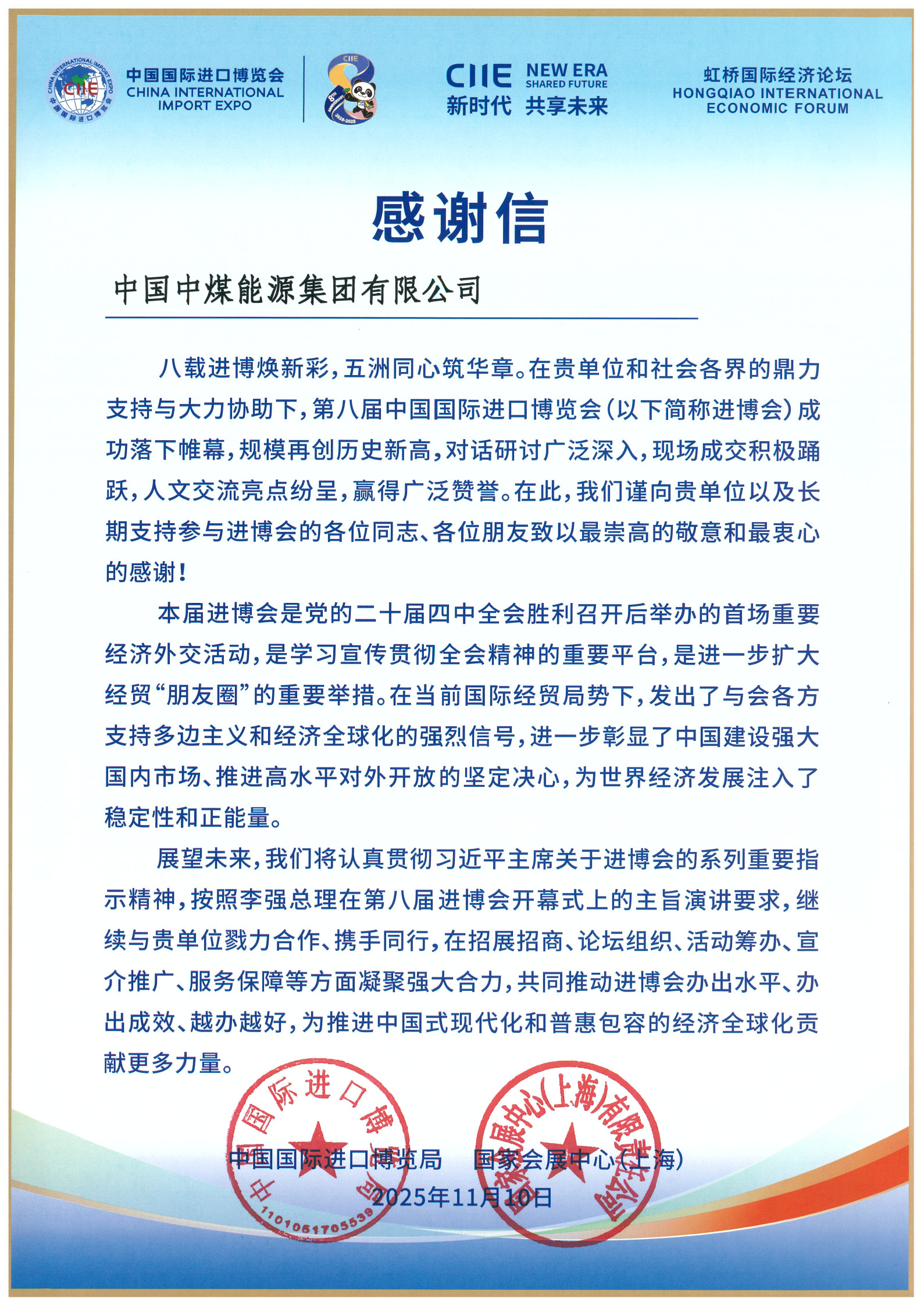 中國國際進(jìn)口博覽局感謝信